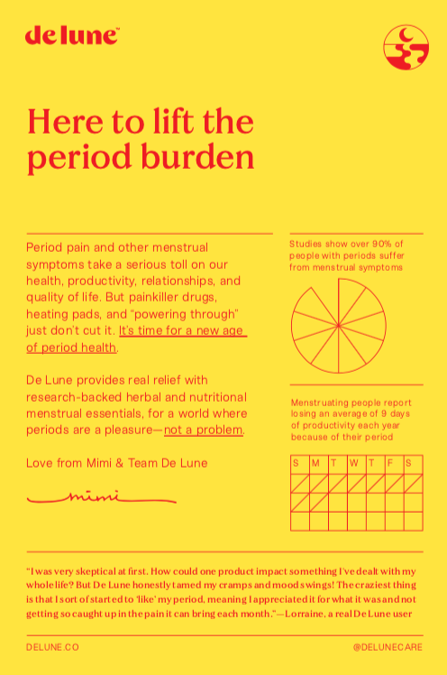 De Lune is a pioneering company that offers research-backed, natural relief of period symptoms and menstrual health resources. They’re actively building a world where menstruation and period symptoms are no longer taboo. I worked with a strategic and creative team to refresh De Lune’s brand system, including a new tone of voice, site copy, and product naming. The result is an approachable yet sophisticated identity to take this groundbreaking brand into the new age of period health.